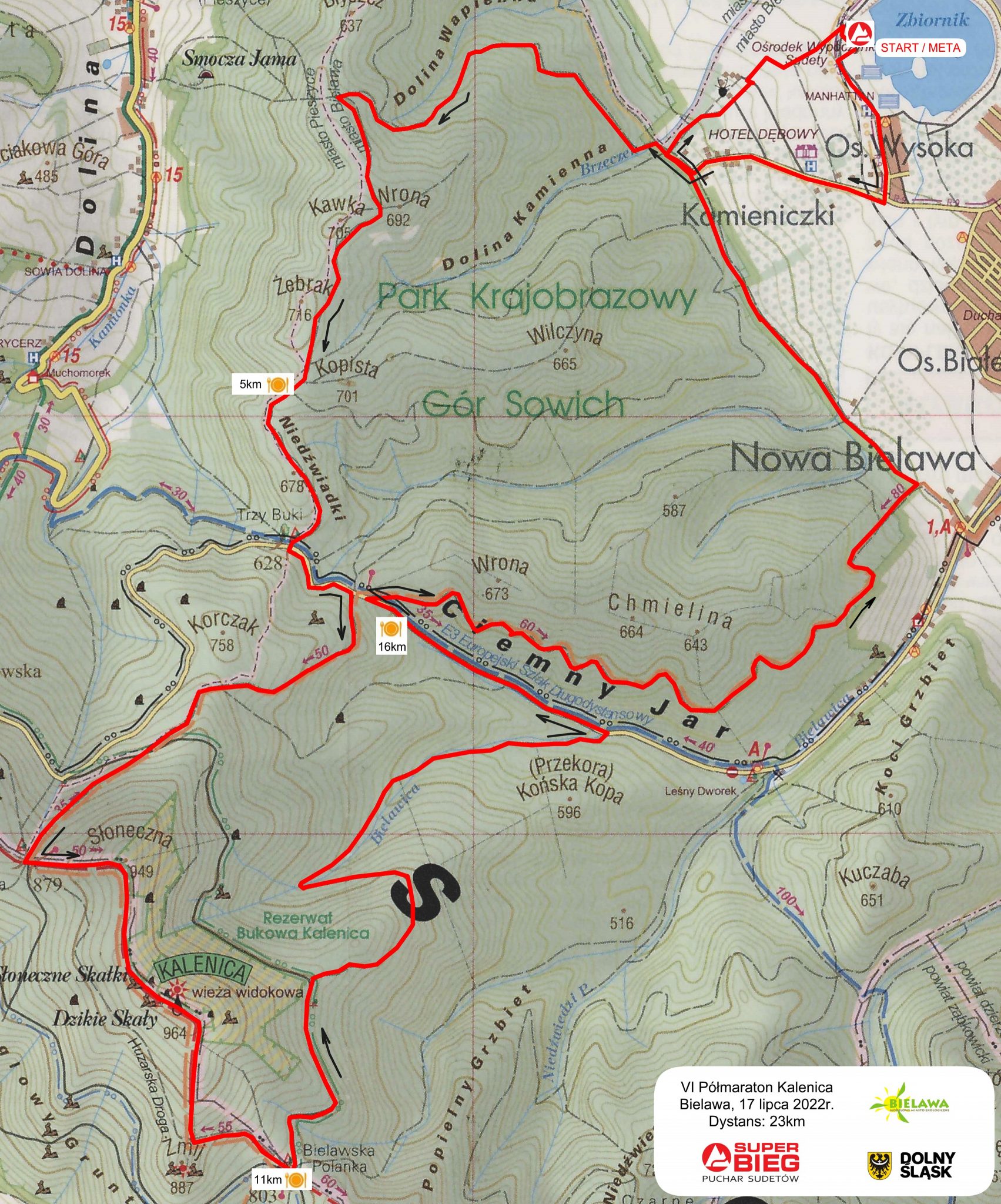 Ultra Sowa to już prawdziwa przygoda, zarówno jeśli chodzi o dystans, jak i otoczenie. Trasa najpierw wiedzie nad Bielawą i Pieszycami, trawersując grzbiet Gór Sowich, a potem wdziera się w najwyższe partie masywu, zaliczając oczywiście po drodze Wielką Sowę. Po trawersie Małej Sowy obniża się na drugą stronę gór, do Sokolca, dociera do Przełęczy Jugowskiej, wspina się na Kalenicę i powoli sprowadza do brzegów Jeziora Bielawskiego.
