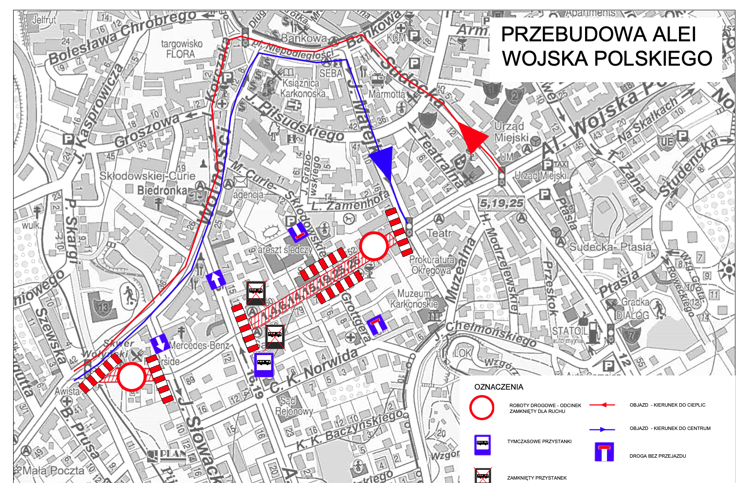 – objazd w kierunku cieplic poprowadzony zostanie ul. Sudecką, Bankową, przez pl. Niepodległości, ul. Korczaka i Wolności